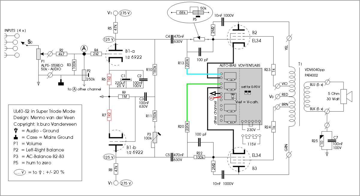 The last years some minor changes were introduced into the UL40-S2. The power valves EL34 were replaced by the 6550 valves. The screen grid resistors R23,24 were changed into 1 kOhm to dampen any oscillation. Not so long ago, the superior Super Triode (ST) mode was introduced, which delivers full output power while being a real triode amplifier. Even more recently the auto-bias unit was introduced to ensure exactly equal quiescent currents. With all these improvements and changes, the amp functions much better. But in me there grew a certain doubt. Anytime you change something here, it might have negative influence on other spots of the amp. Therefore I decided to check the complete amp once again, to measure everything. And what happened? I found that the driver stage (B1) hardly was able to deliver enough AC voltage for the power valves. In the old situation with only EL34 valves, everything was fine. But the 6550 valve asks for more AC voltage on its control grid, while the ST-mode even asks for extra AC-drive. These changes caused the B1 tube to be at the edge of its capabilities. To improve the cathode resistors R6 and R7 should be removed (they were 680 Ohms) and replaced by resistors of 1k2. Under this condition the valve B1 gets much more headroom and easily can deliver the larger AC voltage. See the schematics for more information.